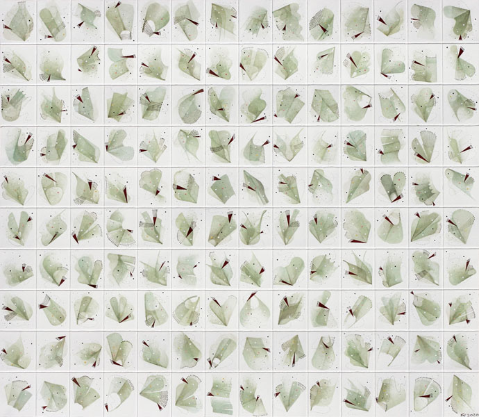 During the first lockdown in 2020, I started drawing new leaves of Jasmine, inspired by the view from my garden studio. I always try a lot of small sketches first and then place them in a grid structure, which became , this case, “Green Stylus”. Grid structures give a sense of order and also help understanding what they are.